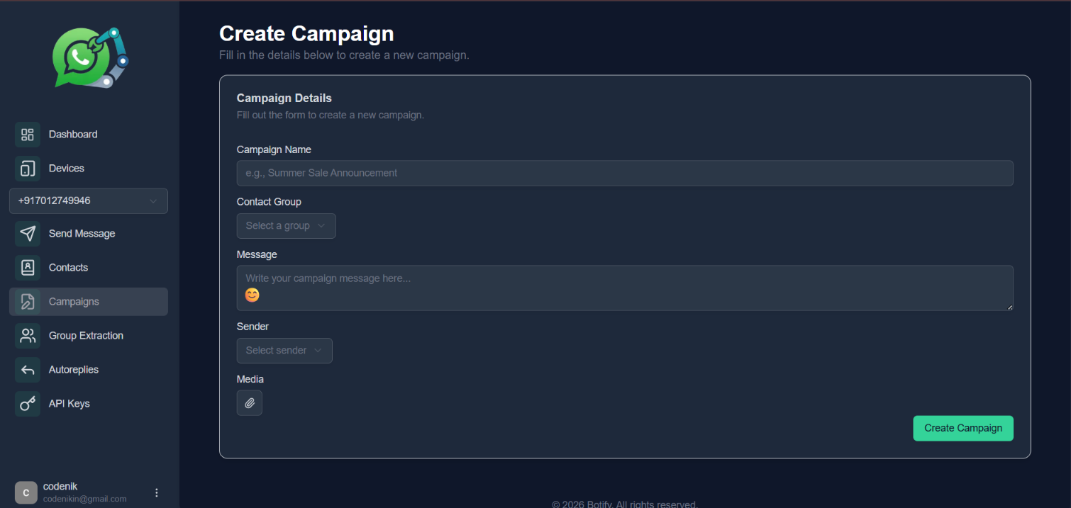 Once confirmed, log in to your dashboard, create your user profile, and connect the WhatsApp number you want to use for sending messages.